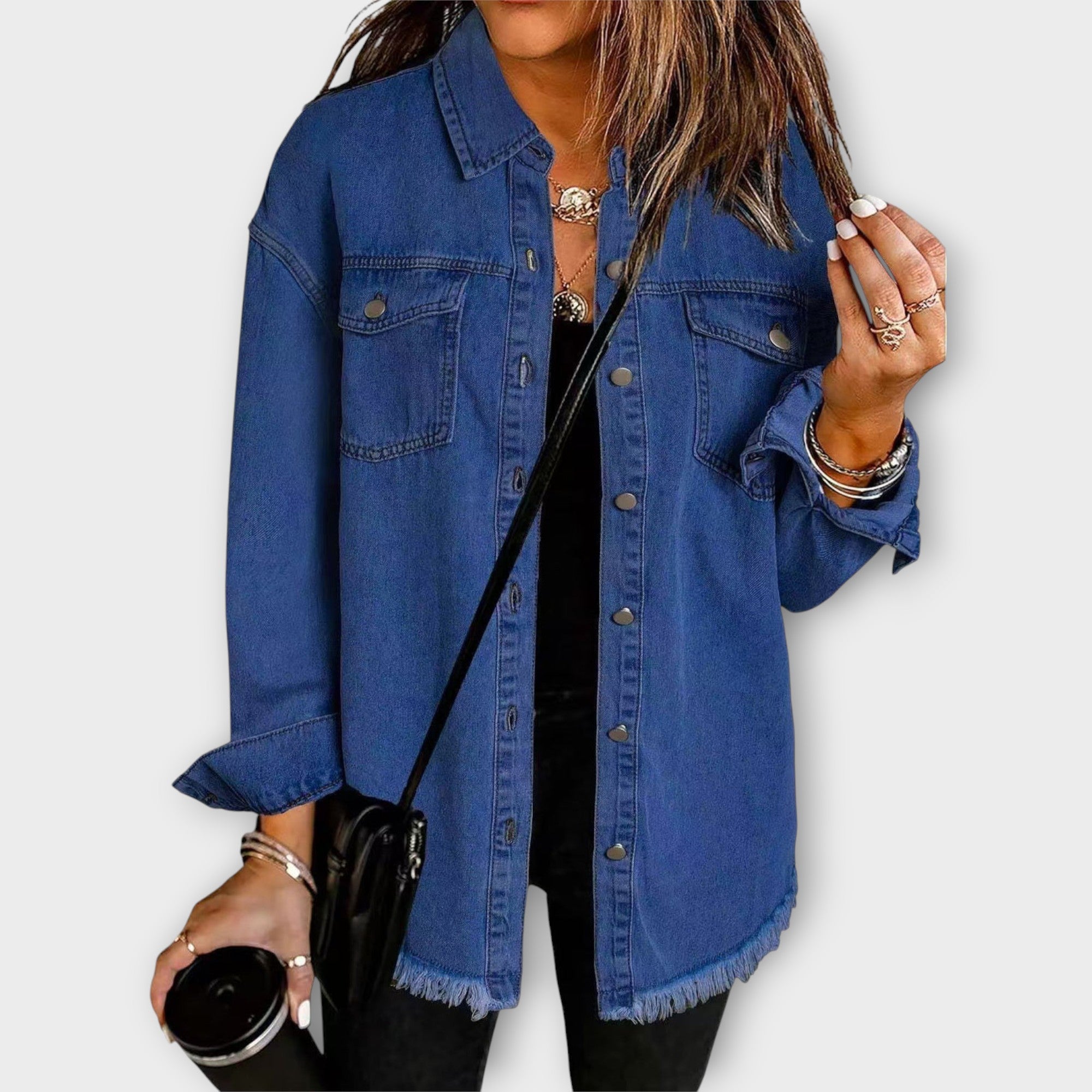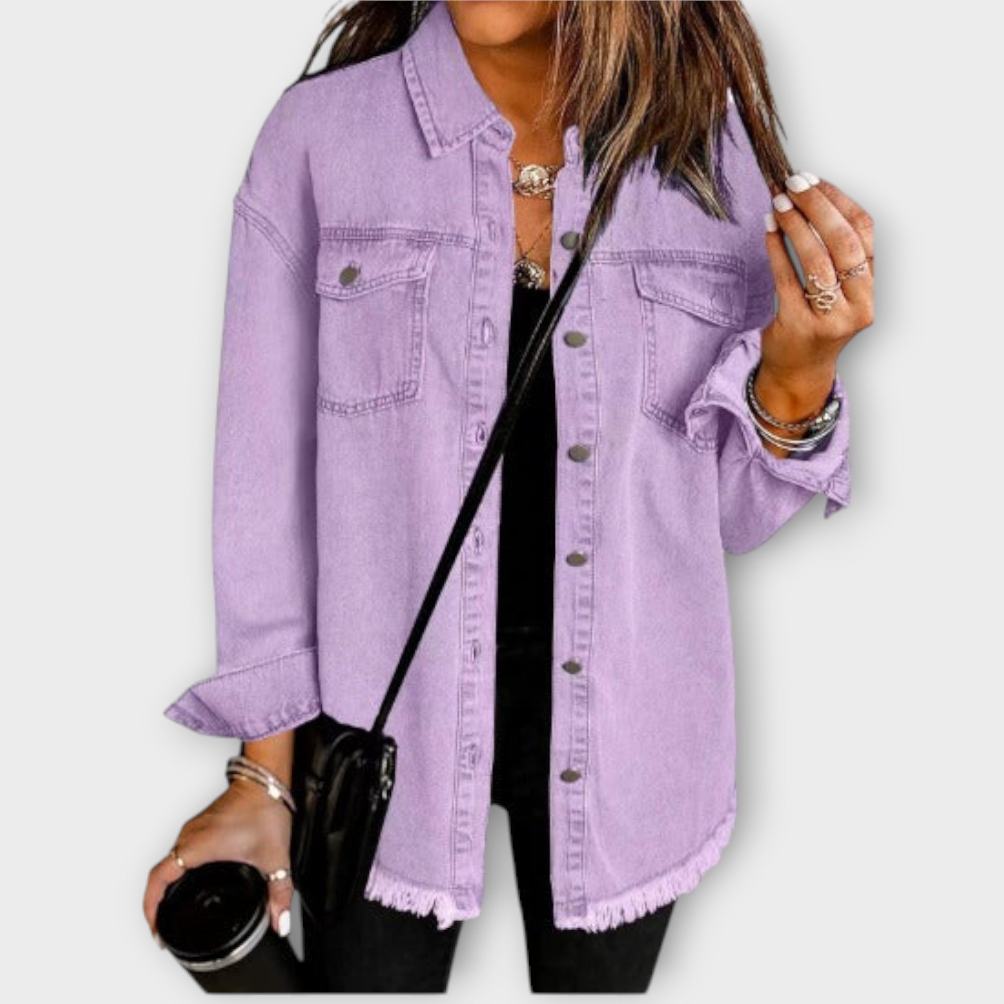Korte lengte op heuphoogte voor makkelijke styling met jeans of rok.