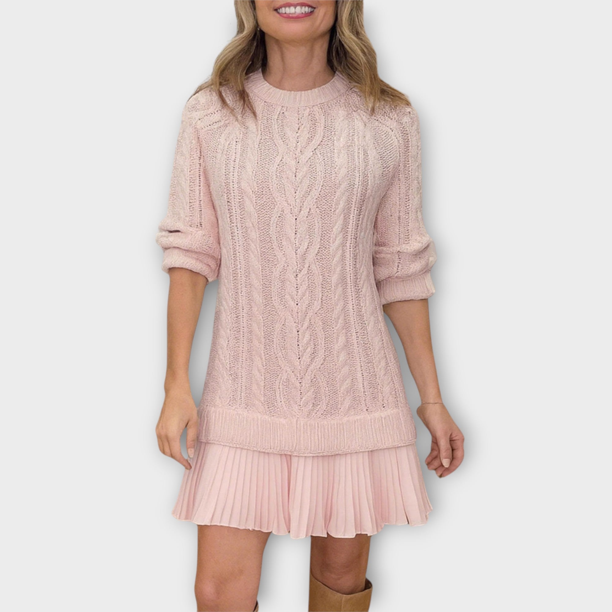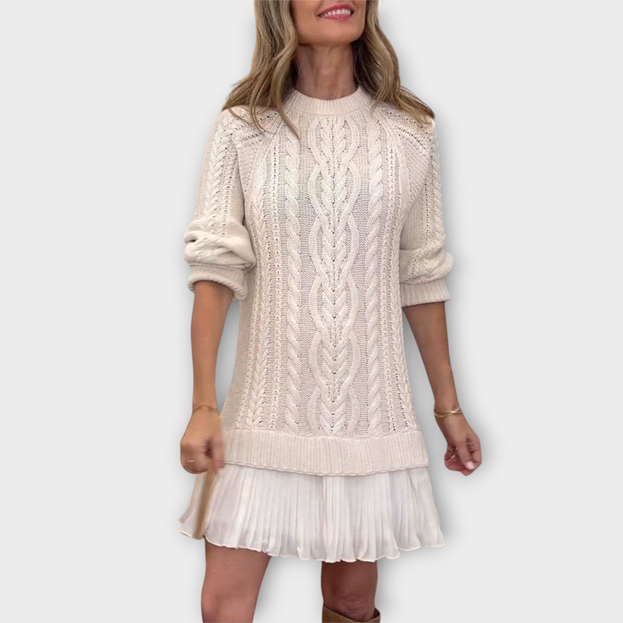 De rechte snit met kabelaccenten oogt verzorgd, terwijl de geplooide zoom een speelse twist toevoegt.